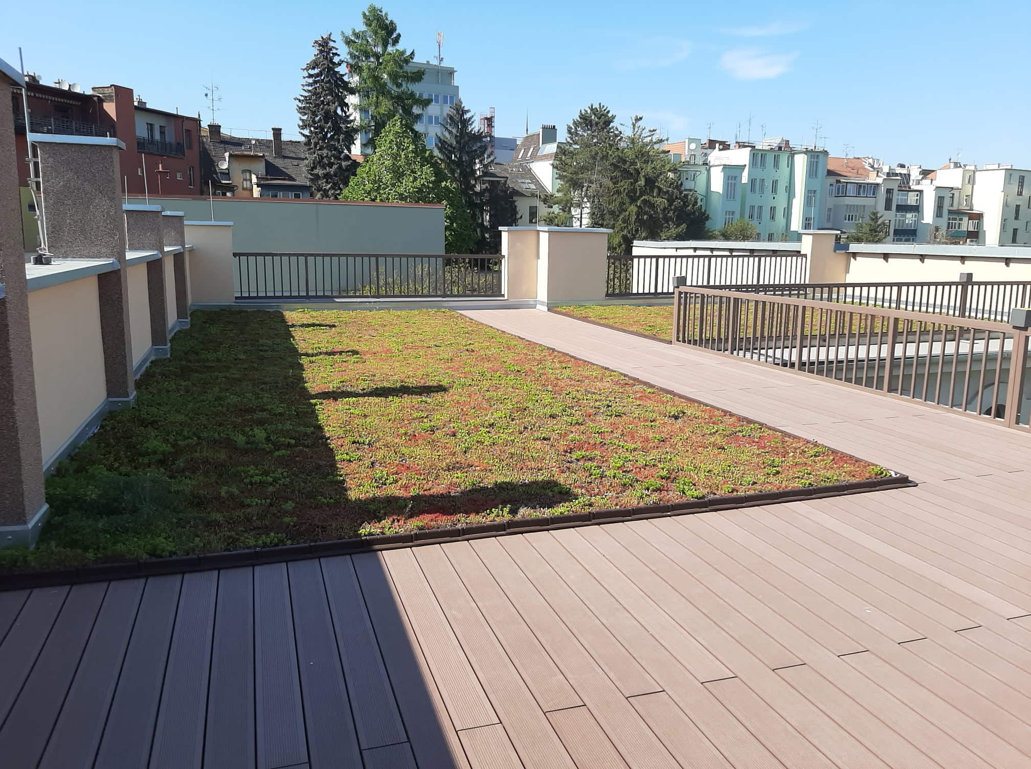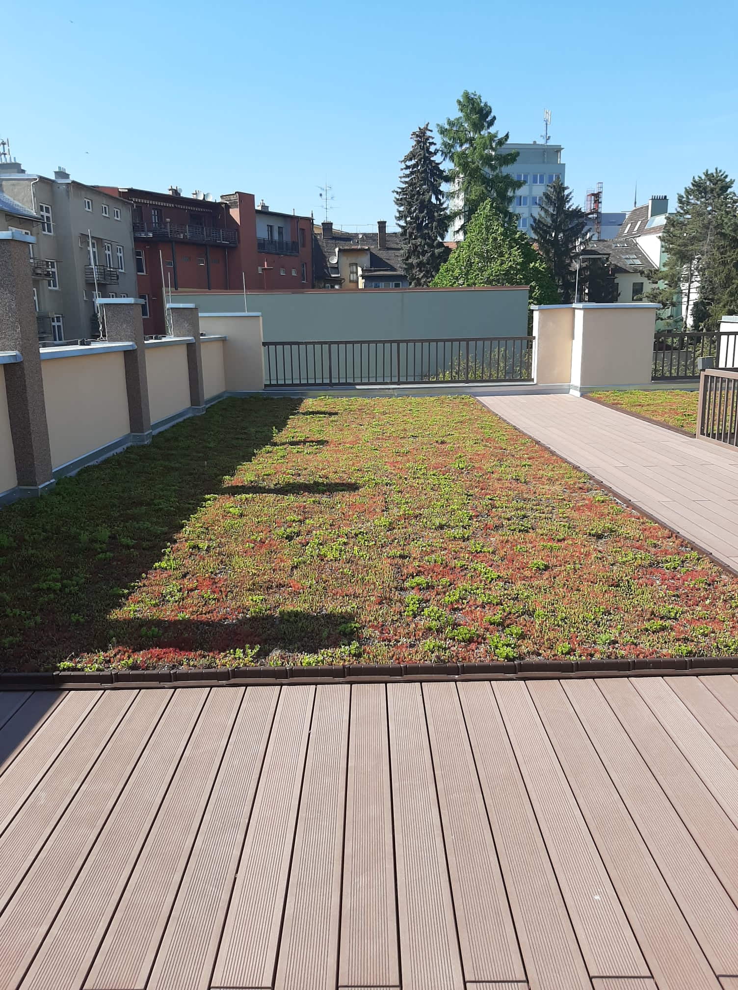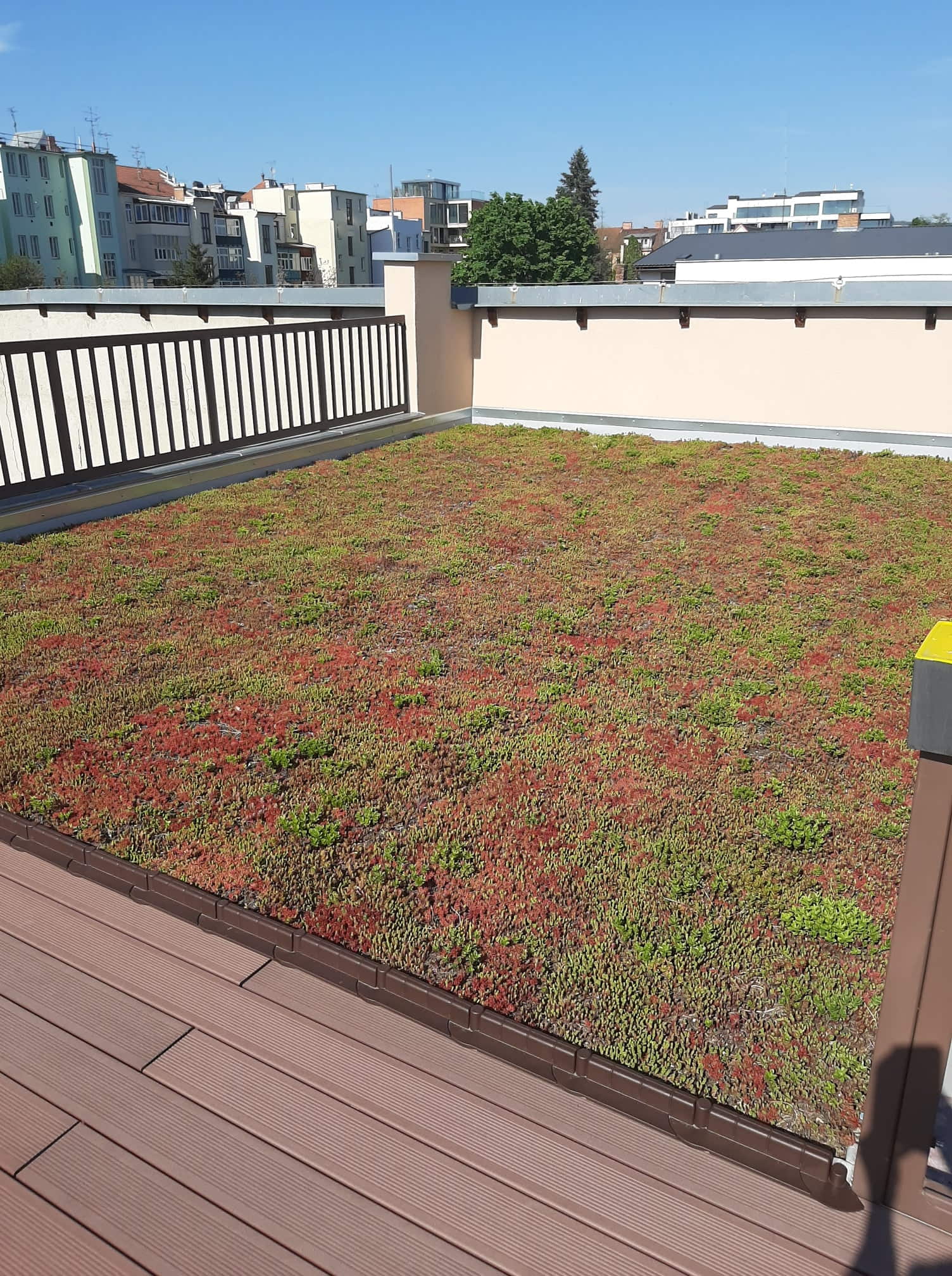 Tady máte fotografie našich 2 realizací z loňského roku. Na jedné střeše je zachycena zelená koruna prvního paneláku v Brně, kde jsme zelenou střechu realizovali loni a druhá střecha je z centra města z ulice Francouzské. Střecha krásně prorostla a majitelé je zachytili ve fázi květu. Vše funguje, jak má, s minimálním zásahem z venčí.